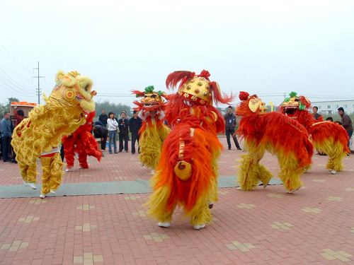 公司邀請?jiān)趭W運(yùn)會上表演的劉吉舞獅團(tuán)為慶典助興