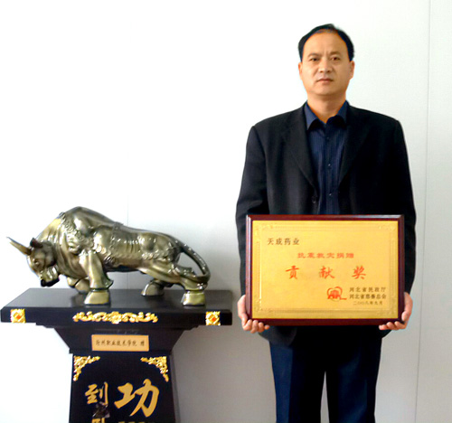 汶川大地震,捐獻(xiàn)價值100萬藥品,職工集資38560元。九月份,被河北省民政廳、慈善總會授予抗震救災(zāi)貢獻(xiàn)獎。副總王顥捧著這塊獎牌非常高興。