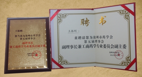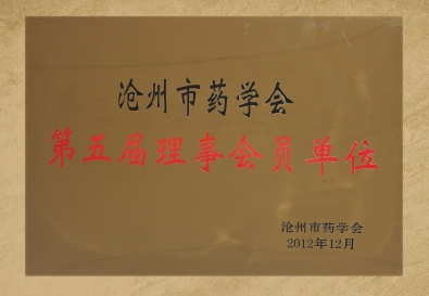 2013年3月份,由滄州市藥學(xué)會(huì)頒發(fā)給我公司“滄州市藥學(xué)會(huì)第五屆理事會(huì)員單位”銅牌,并聘請(qǐng)我公司董事長(zhǎng)、總經(jīng)理為滄州市藥學(xué)會(huì)第五屆理事會(huì)副理事兼藥學(xué)專業(yè)委員會(huì)副主委。