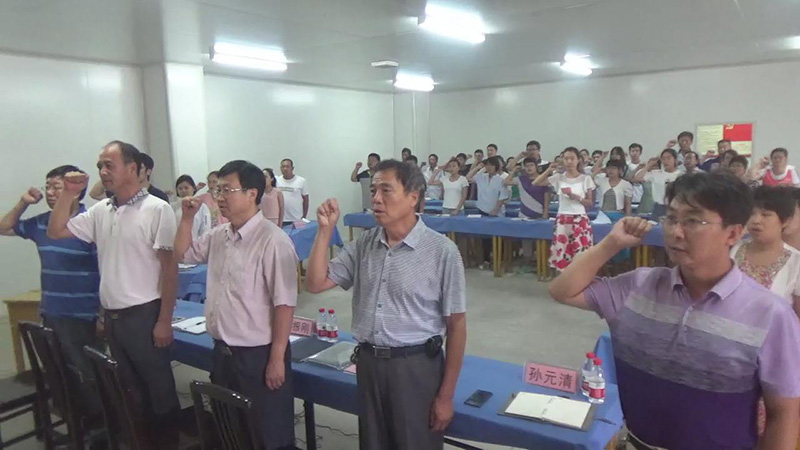 大會(huì)開始,全體黨員起立,高唱國(guó)歌,面對(duì)黨旗重溫誓詞莊嚴(yán)宣誓。